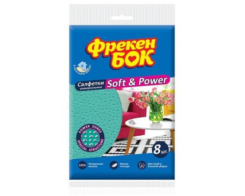 Інноваційні віскозне серветки Soft & Power Фрекен БОК з м'якою, однорідної, приємною на дотик текстурою. Не залишають розводів і ворсинок, добре вбирають вологу, легко стираються. Підходять для всіх видів вологого і сухого прибирання.
